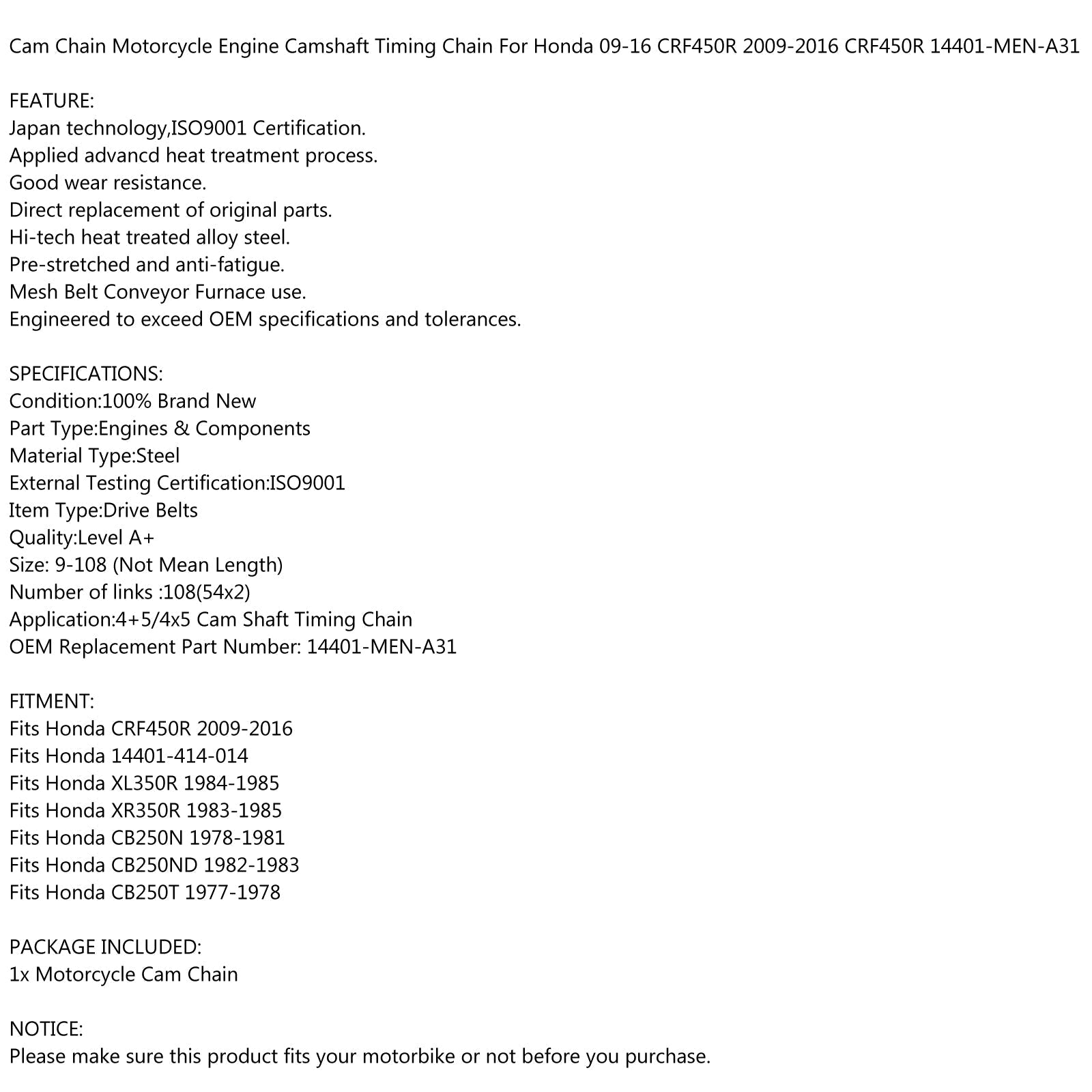 Timing Cam Chain Fit for Honda CRF450R 09-15 XL350R XR350R 83-85 CB250 78-83 Generic